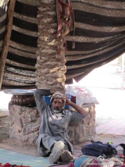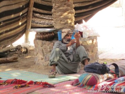 Bedouin tents in the desert. As a nomadic people, the Bedouins live by the side of camel in desert. They have an intimate relationship with the camels: the man in the picture built a new house in the city for his father, but his father just couldn’t get used to living in a room and decided to let the camels live there instead, while he returned to live in the tents built for camels.