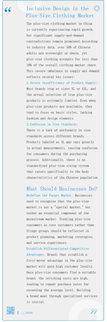 True confidence should not depend on external influences, and the development direction of plus-size clothing should not be limited to simply expanding size ranges. Instead, it should achieve genuine inclusivity at both the design and marketing levels.