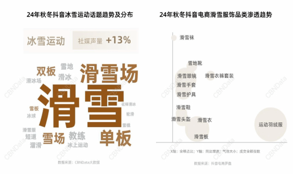 In recent years, many cities have opened ski resorts. According to a 2024 Douyin white paper, searches for skiing-related content ranked high, with snowboarding’s “trendy and photogenic” appeal especially popular. Ski-related social media discussions grew by 13%, and insulated down jackets achieved the highest transaction volumes.