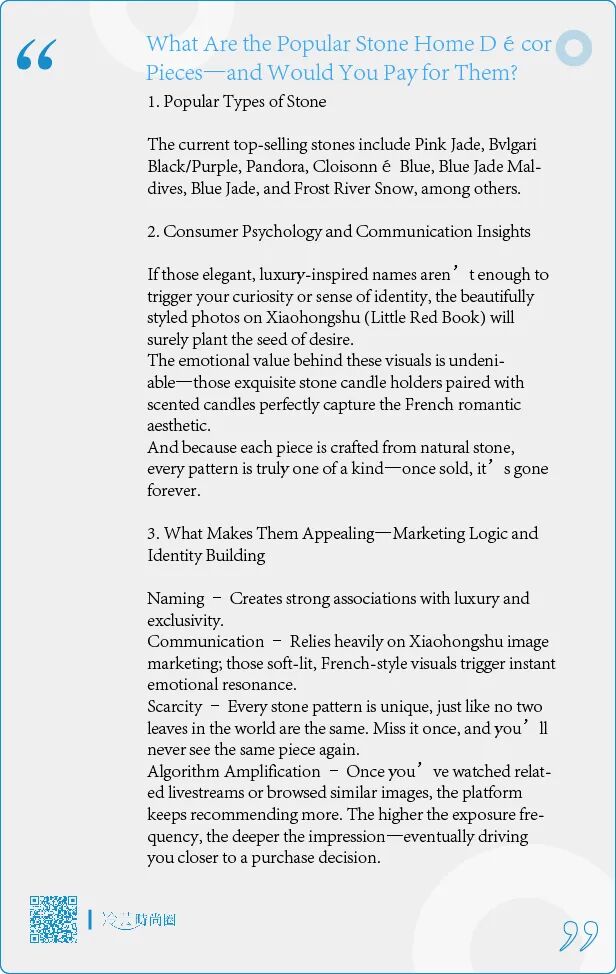 Stone décor may have greater potential overseas, where consumers invest more heavily in interior design. In fact, the stone homeware trend originated abroad and has since matured in foreign markets. However, cost advantages are limited since most raw stones are imported—similar to the diamond trade.