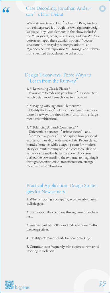 Brands often retain signature silhouettes while innovating through details and materials. Patterns — such as Dior’s iconic rose — can be reinterpreted through new design techniques. Craftsmanship must also evolve with the times.