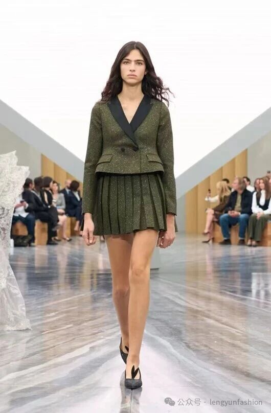 Classic pieces were made more contemporary. Dior’s iconic black-and-white suits featured shortened skirts and jackets, with asymmetrical hems that felt lighter and less rigid. Previously complex pleating techniques were simplified into more wearable, everyday versions, combined with relaxed knitwear for comfort and ease.